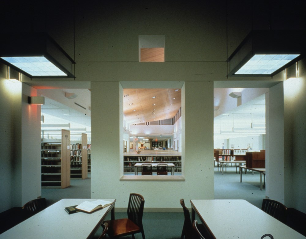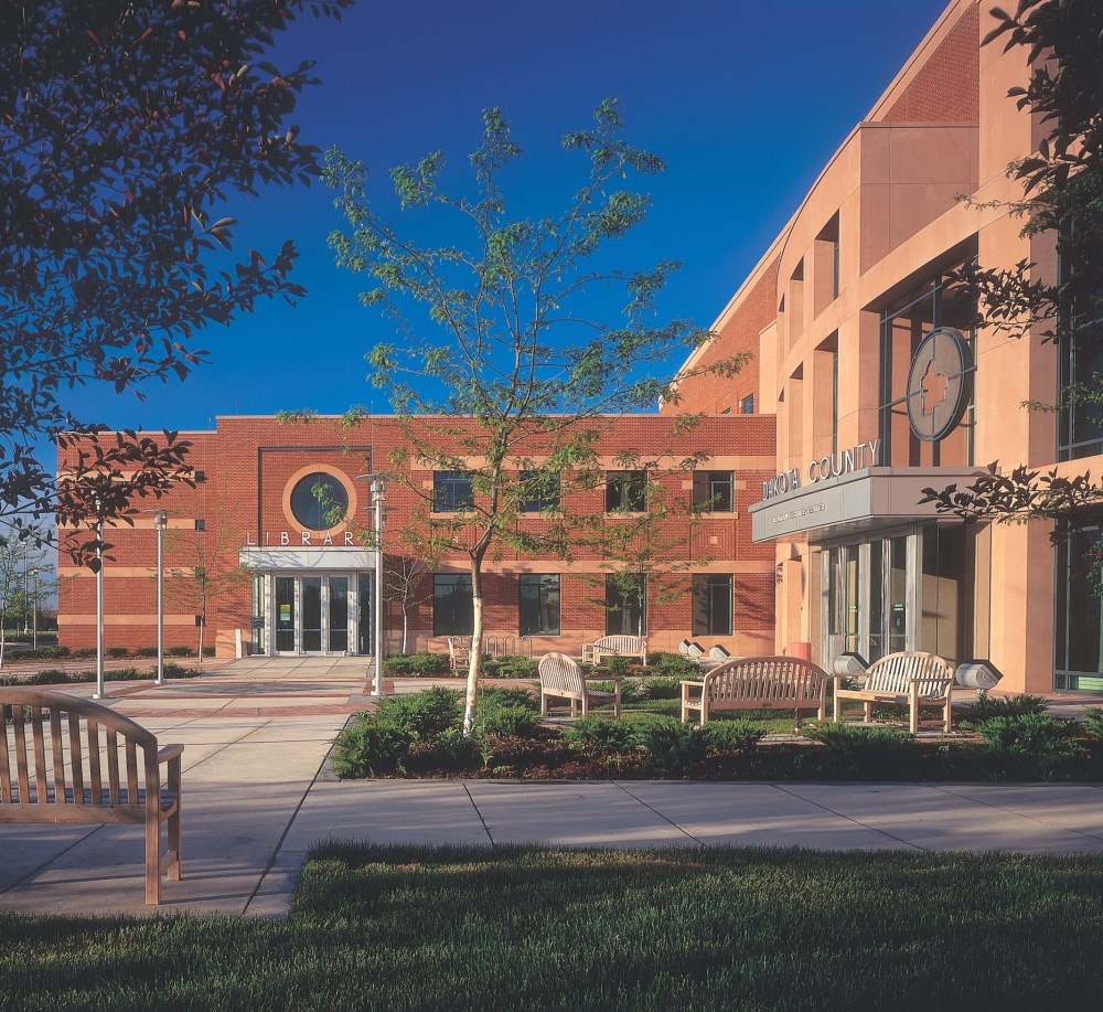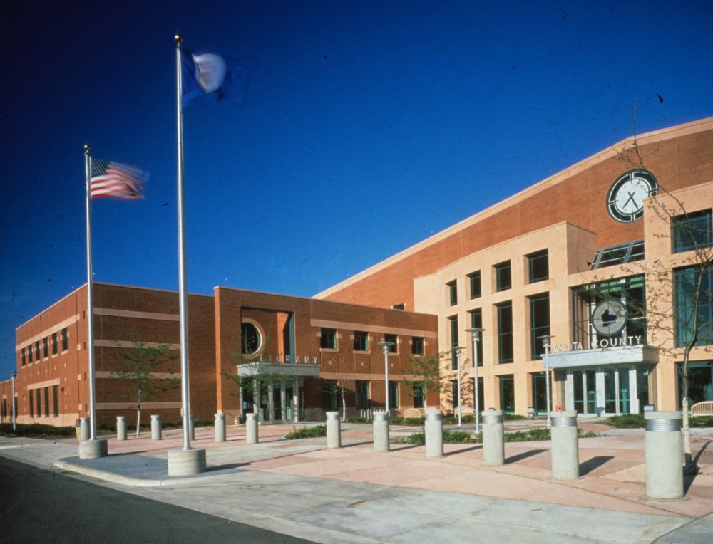 Housed within the Dakota County Service Center, the Galaxie Library achieves its own distinctive look and identity. Its facade is more intricately detailed and it has a lower profile overall. On the inside the library is designed to be especially warm and welcoming - and functional. Warm colors, wood, and abundant day lighting contribute to an inviting interior. A special children's room is circular in shape and features soft carpeted steps that double as seats, and brightly colored windowpanes that create constantly changing patterns of light. The Galaxie Library also includes a flexible meeting room for community events as well as patron use.