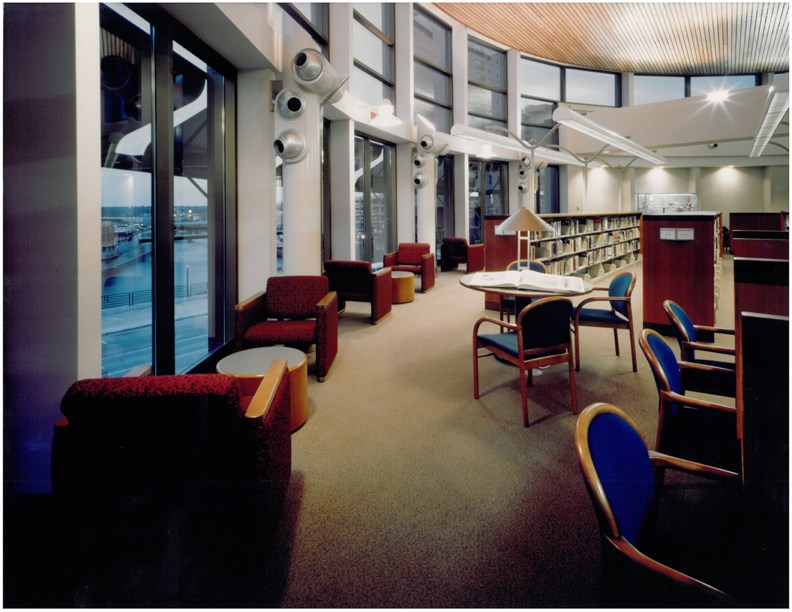 This library is a distinctive and contemporary addition to the center of downtown Rochester, Minnesota, home to the Mayo Clinic. A graceful, glass-enclosed rotunda creates a unique identity and focal point, and also provides appealing river views and a sunny southern exposure. Inside, the library incorporates advanced technology that impacts everything from customer services and materials handling to communications and information systems. Enclosed ramps (skyways) link the library to its adjacent parking ramp and the Mayo Civic Center.