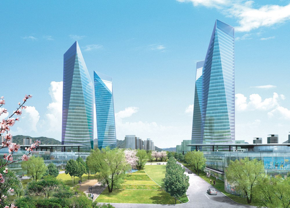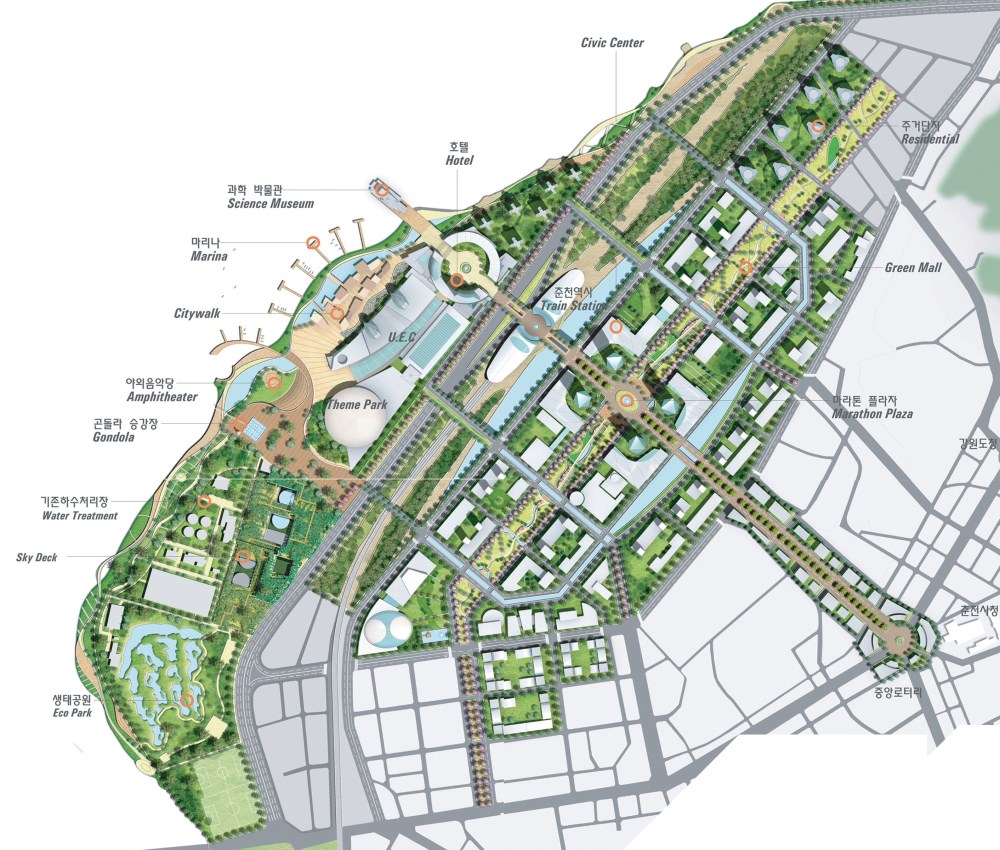Rising above and along the waterfront in Chuncheon, Korea, this urban master plan is designed to create a central strategic and tourist hub for this region of Korea. Two communities - Lakeside Village and Canal City (each a mix of low buildings and high rises) will be connected by a hub, the Gateway Center, that will also serve as a commercial and transportation center. The development will also encompass two environmentally-friendly attractions, Exploration Island and Ecology Park.
