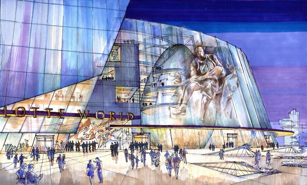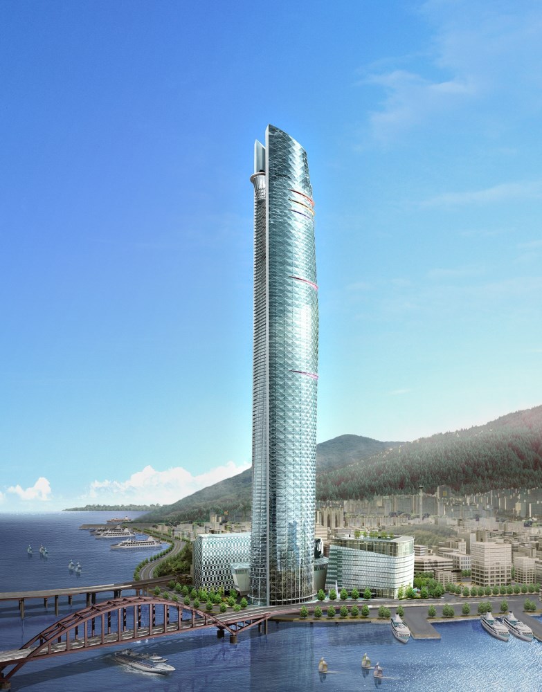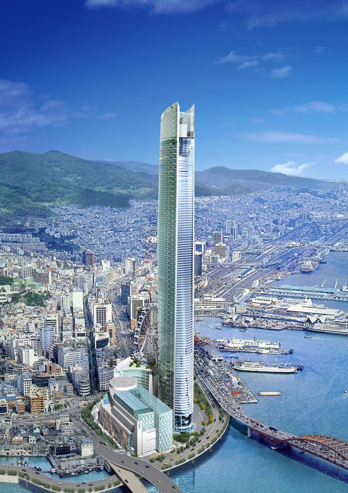 Busan Lotte World towers dramatically over the Nam Harbor Waterfront, near YongDo Island at the foot of Busan's coastal mountains. Surrounded by highways and traditional markets, it is a perfect setting for this urban shopping and entertainment destination. The project combines progressive retail, hotel, office and sports/entertainment facilities into one truly unique and carefully designed complex. The most imposing feature of Lotte World is its 107-story hotel/office tower (pictured here). With a total height of 465 meters, this tower will become one of the tallest buildings in the world.