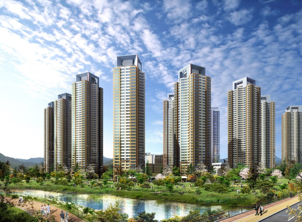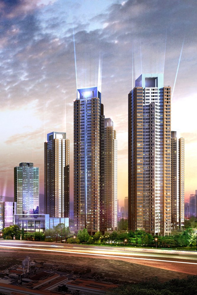 This "collection" of 45-story buildings is almost a community unto itself, providing a significant addition to the housing available in Cheongju, Korea. The towers are positioned to take maximum advantage of natural light. They are grouped in a park-like setting that unites them with gracious and carefully planned landscaping and a series of interesting pedestrian paths.
