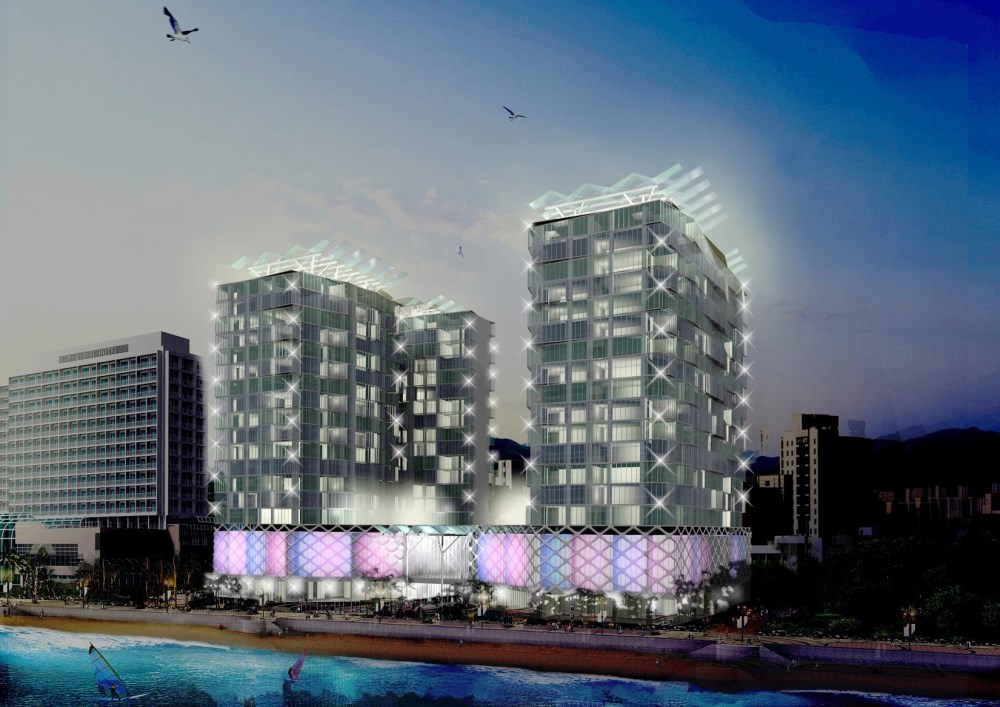 This condominium development is located right on the ocean in Haeundae Beach - which is one of Korea's most popular beaches, and regarded by many as its most beautiful - located at the southeastern end of Busan. Mindful of its setting, the design sets out to symbolize (and thereby respect) this privileged location. It is a 17-story luxury condominium complex containing three stories of underground parking and three stories of retail and entertainment spaces. The lower level (or podium) is set off by a cross-hatched fade that recalls fishing nets, and the window and roof treatments are reminiscent of ocean waves, while the color of the building itself reflects the color of the sea.