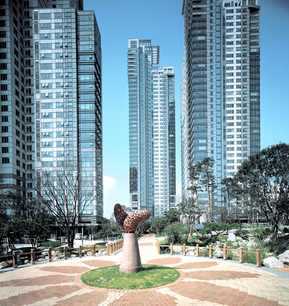 The tallest housing complex in Seoul, Trinity Towers consists of three 46-story buildings containing 350 luxury units (1.5 million SF). Taking advantage of the site's interesting topography, Trinity Towers features an extensive network of trails, plazas, trees and other amenities. Natural light streams in even on the lower levels. The complex itself boasts a health club, retail shops and underground parking. All of this has made Trinity Towers a calm and welcome retreat in the very heart of this bustling city.
