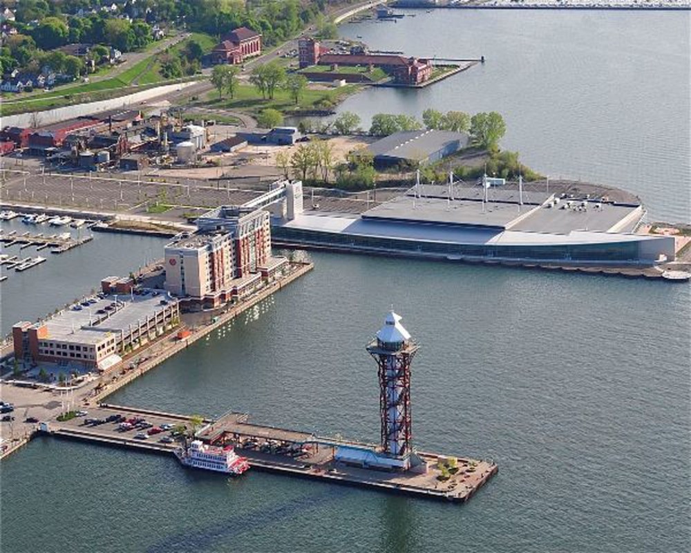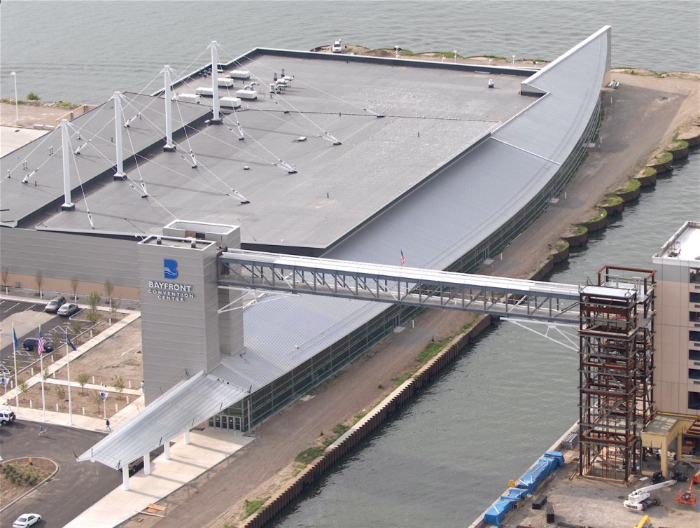 The spectacular Bayfront Convention Center in Erie, Pennsylvania sits directly on the city's beautiful waterfront and has become a focal point and source of civic pride for the city. It has a soaring, open, and - appropriately - almost nautical feel to it. The approach to the Center is dominated by a tower and skybridge that connects the exhibition halls with a hotel and offers dramatic views of the lake on one side and the harbor on the other.