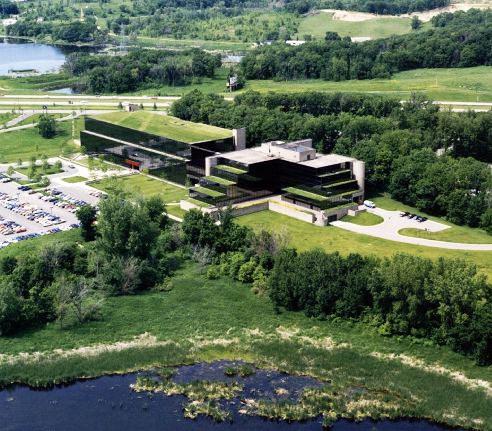 The corporate headquarters for GE Capital is a complex of straightforward glass buildings which, while simple in appearance, were carefully designed and sited to take full advantage of 31 acres of beautiful forest, wetland, meadow, and lake - right in the midst of suburban Eden Prairie, Minnesota. These simple buildings not only reflect and preserve their natural setting, but respect it as well with a host of eco-friendly and energy efficient features, including earth insulated terraces, heat recovery and thermal storage systems.