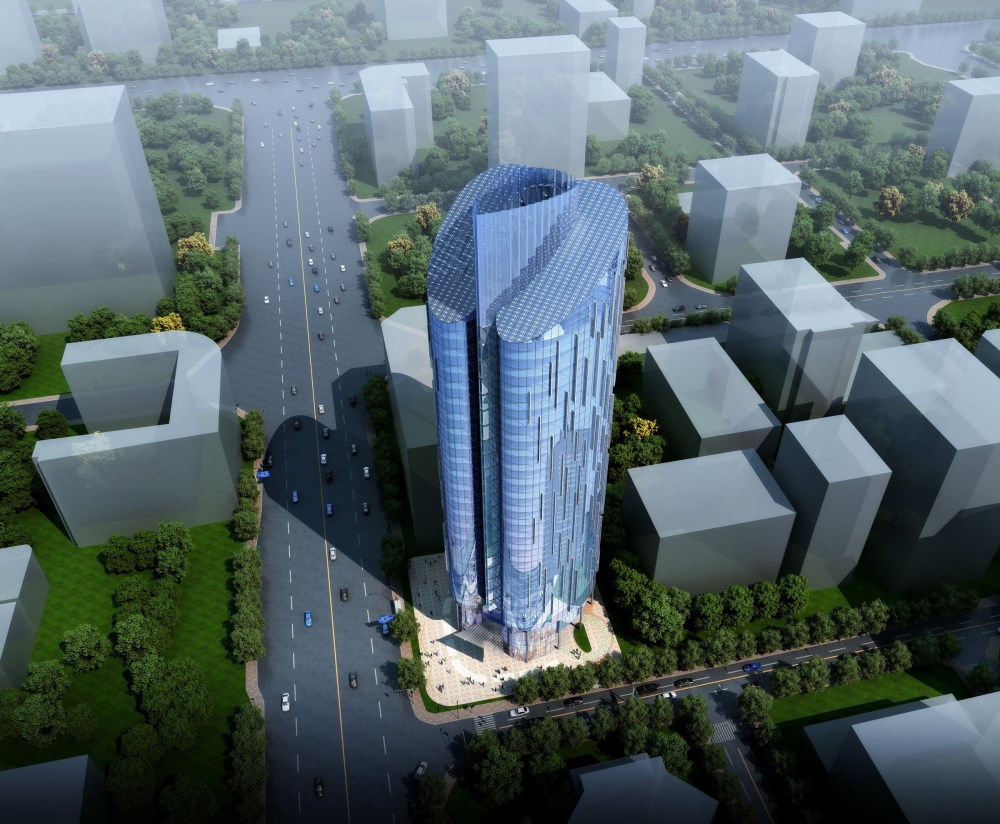 In this version, the tower halves are separated to reduce the massing of the building and emphasize each ellipse. This creates potential green break spaces located at every second or third floor and the cleft also introduces more natural daylight into the core of the building. The exterior is shown in blue reflective glass with vertical fins that are spaced to provide more shading on east and west faces and that create a distinctive aesthetic image. The building "emerges" from a shallow reflective pool that surrounds the lobby. Solar collectors cover the sloped roof.